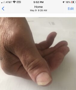MAY 9, 2023 LAST TWO OF FOUR PHOTOS SHOWS THAT LESS THAN 6 WEEKS FROM DATE OF INJURY, HIS THUMB WAS HEALED AND JOHN REGREW THE END OF HIS THUMB .